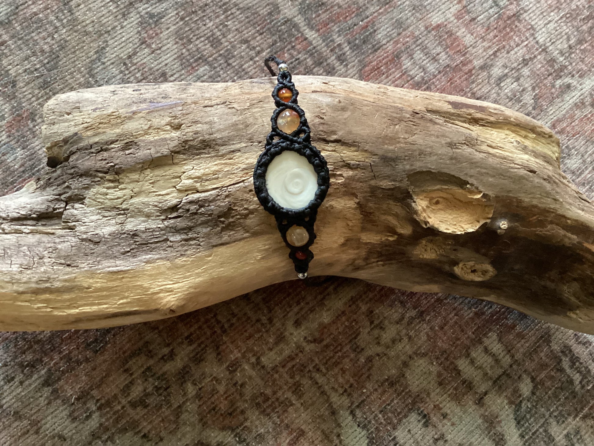 Black knotted adjustable bracelet with shiva eye fossil and orange accents