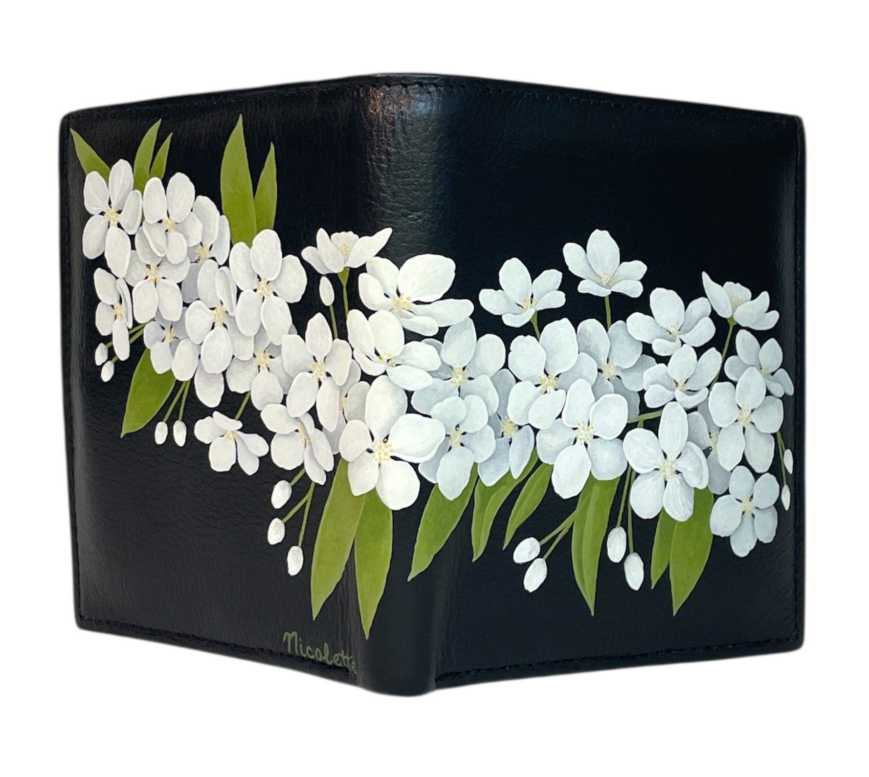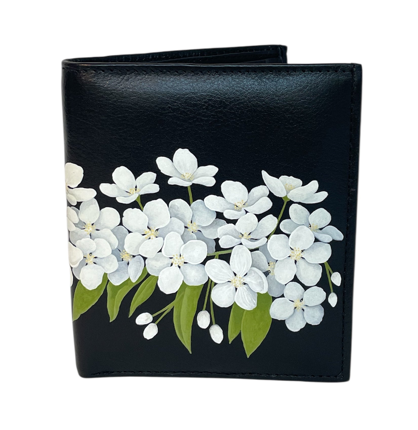 Black Leather Bi-Fold Wallet- "White Thunderchild Crabapple Blossoms"