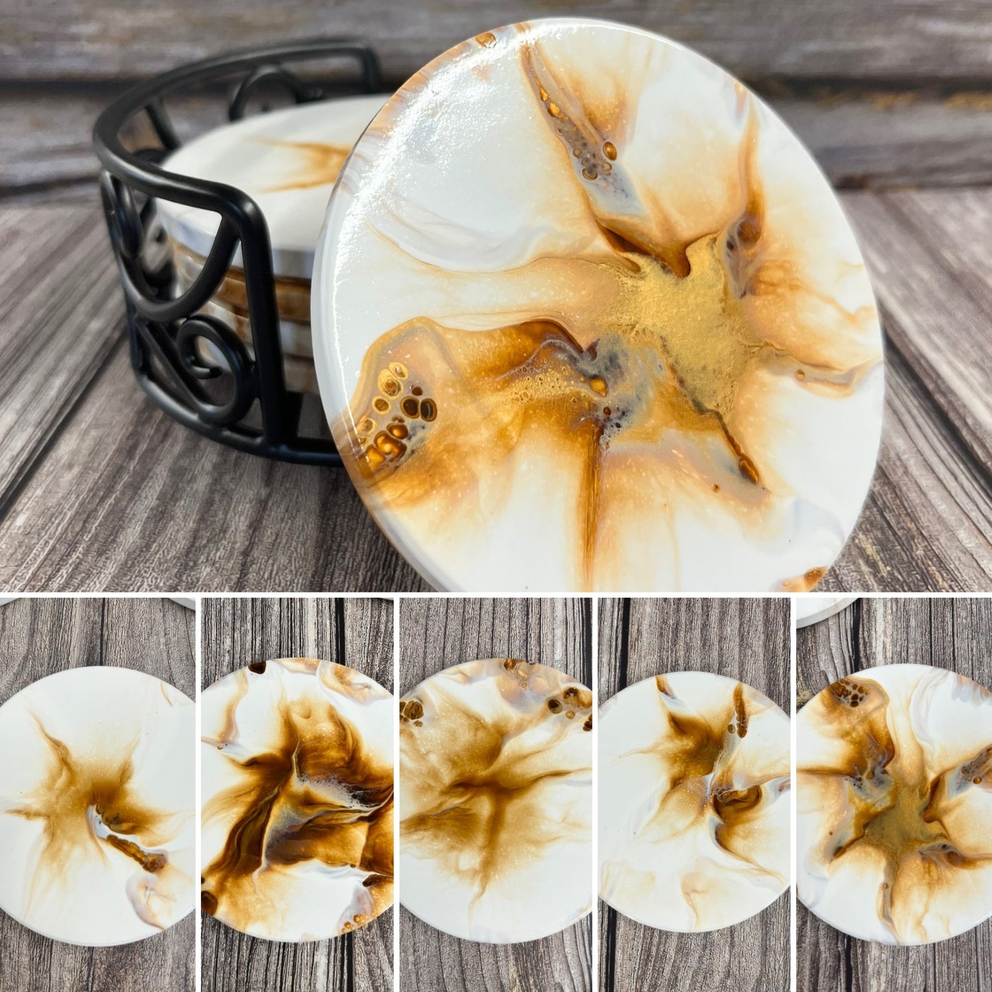 " Brown and Gold" Set Of 5 Coasters with Holder