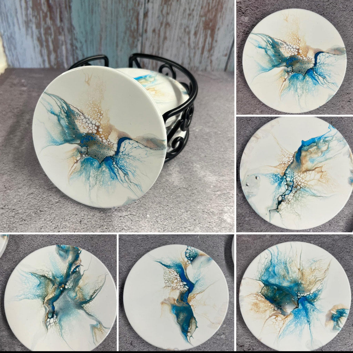 Coaster Set "Blue, Tan, and White" Set Of 5 W/ Holder