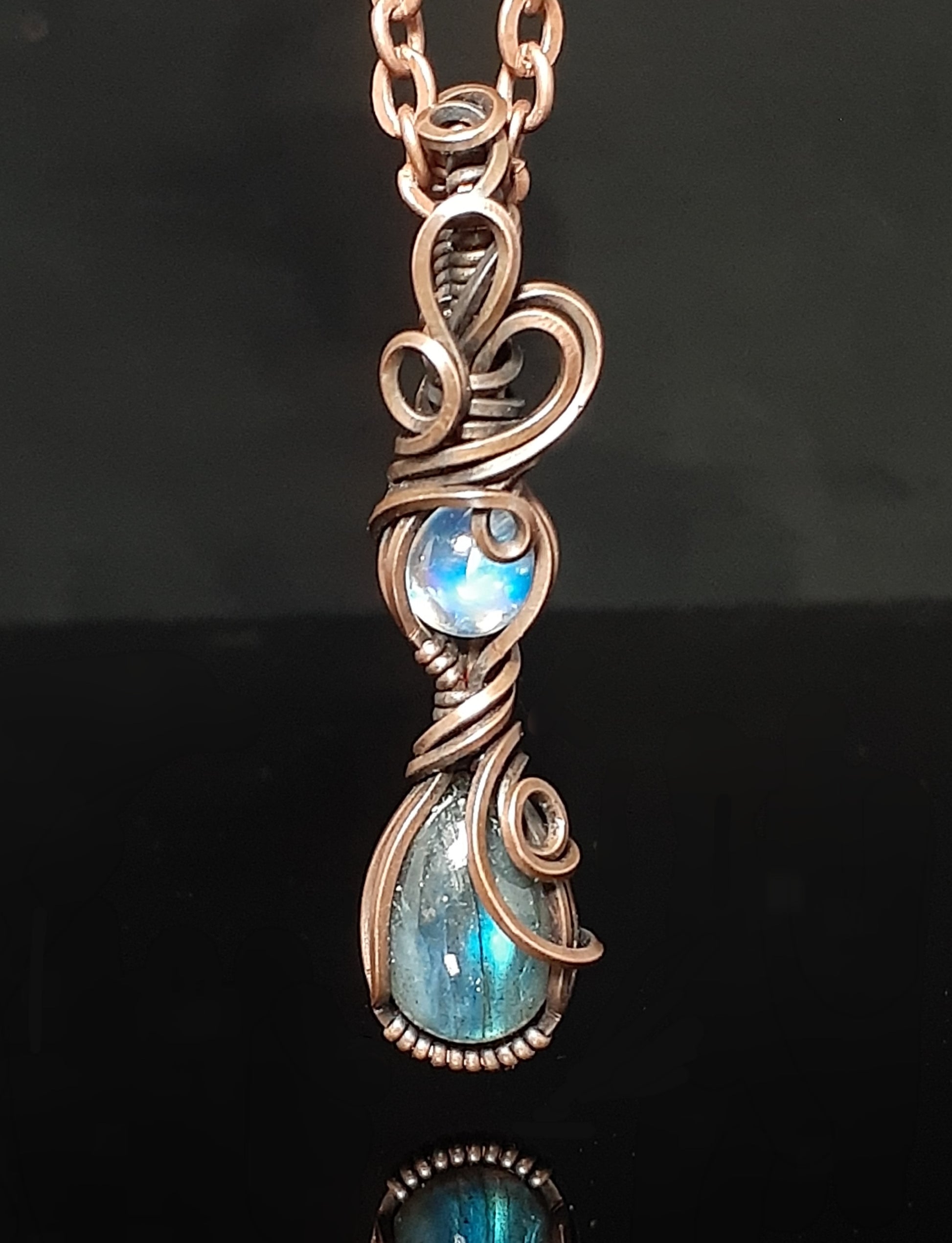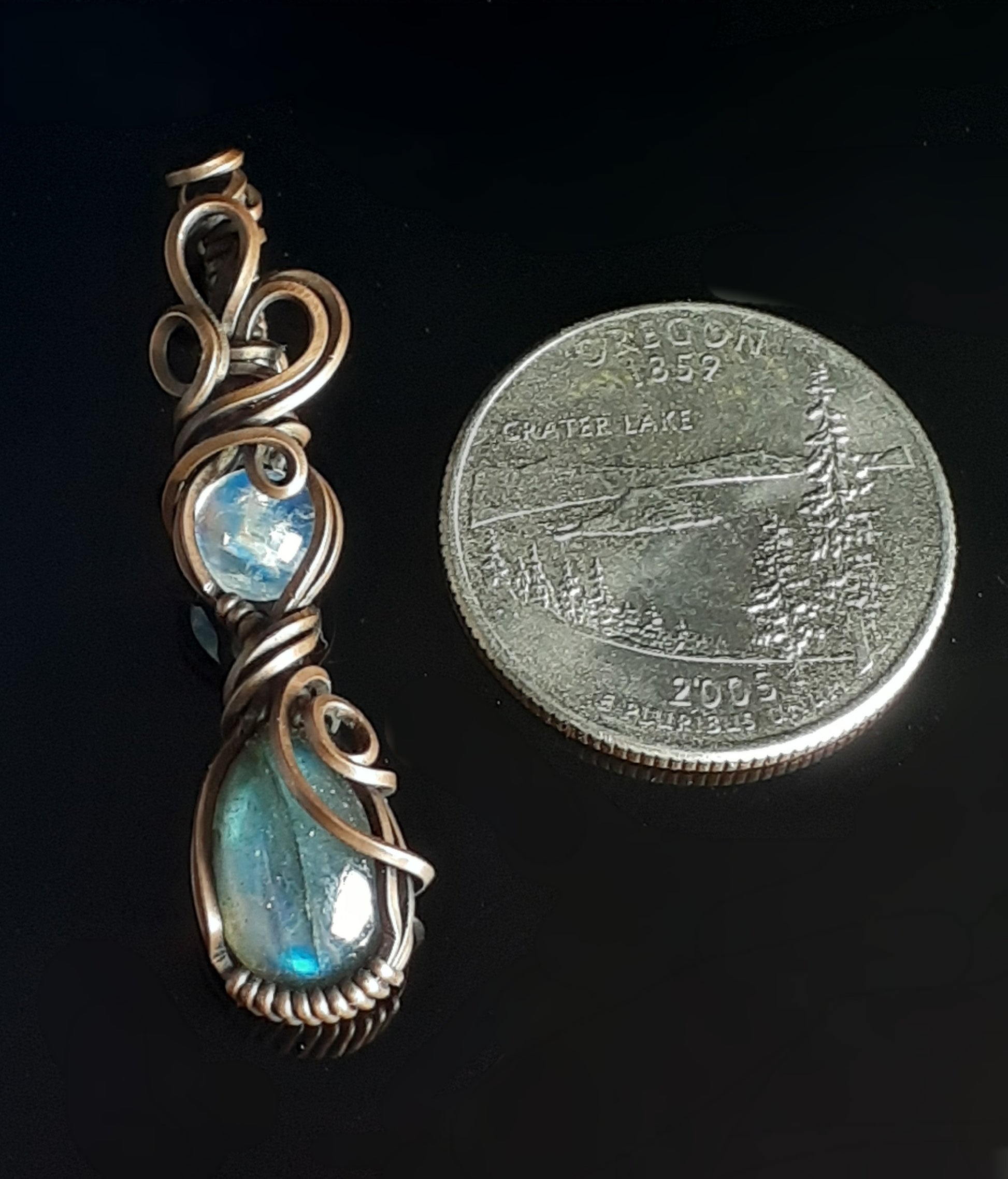 Small labradorite  and rainbow moonstone wrapped in oxidized copper