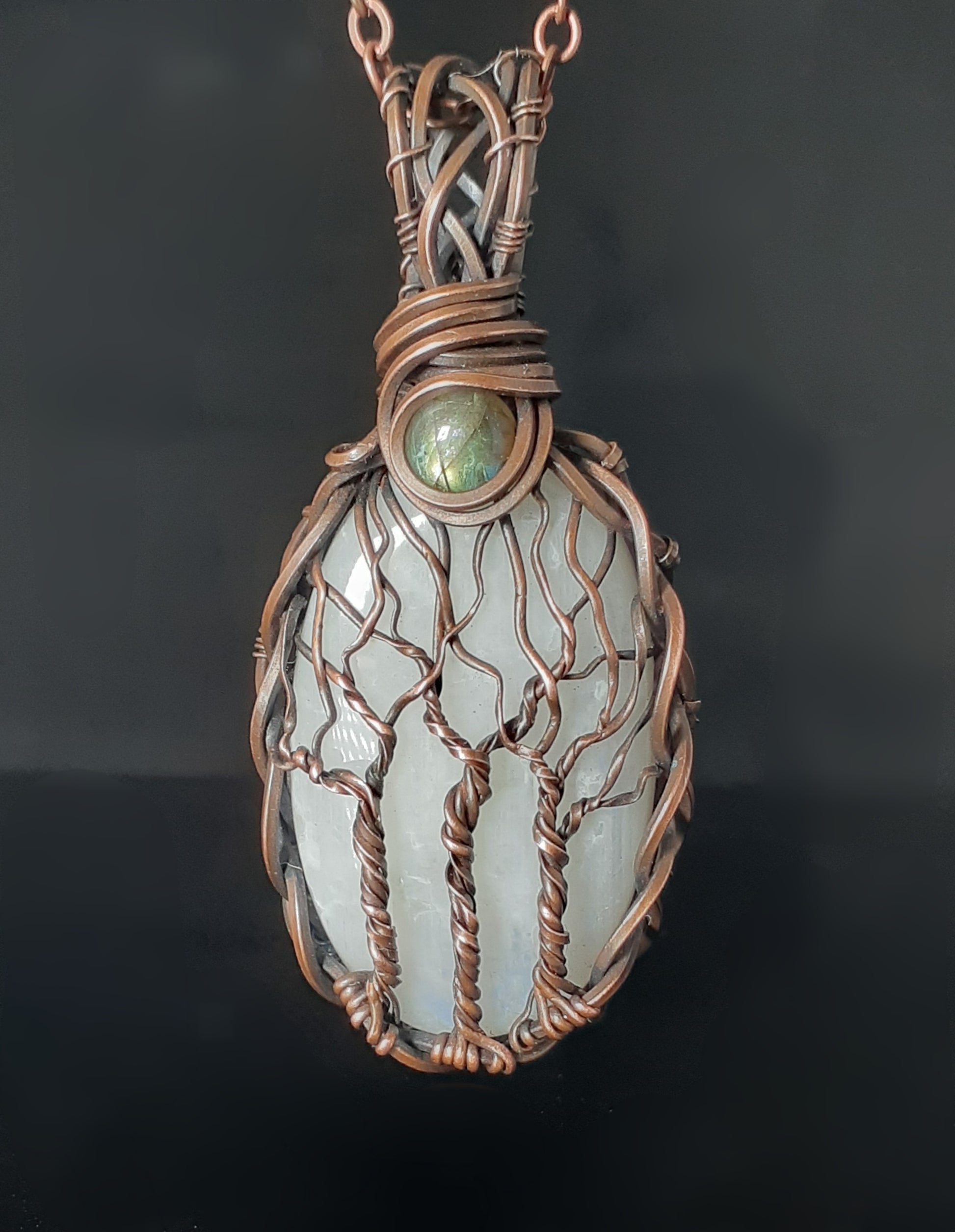 Rainbow moonstone labradorite tree of life oxidize copper pendent style necklace