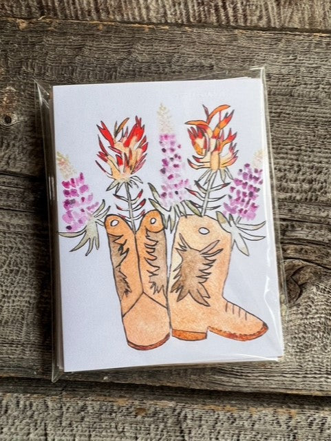 Cowboy Boots With Indian Paintbrush And Lupin Watercolor Card 4 Pack