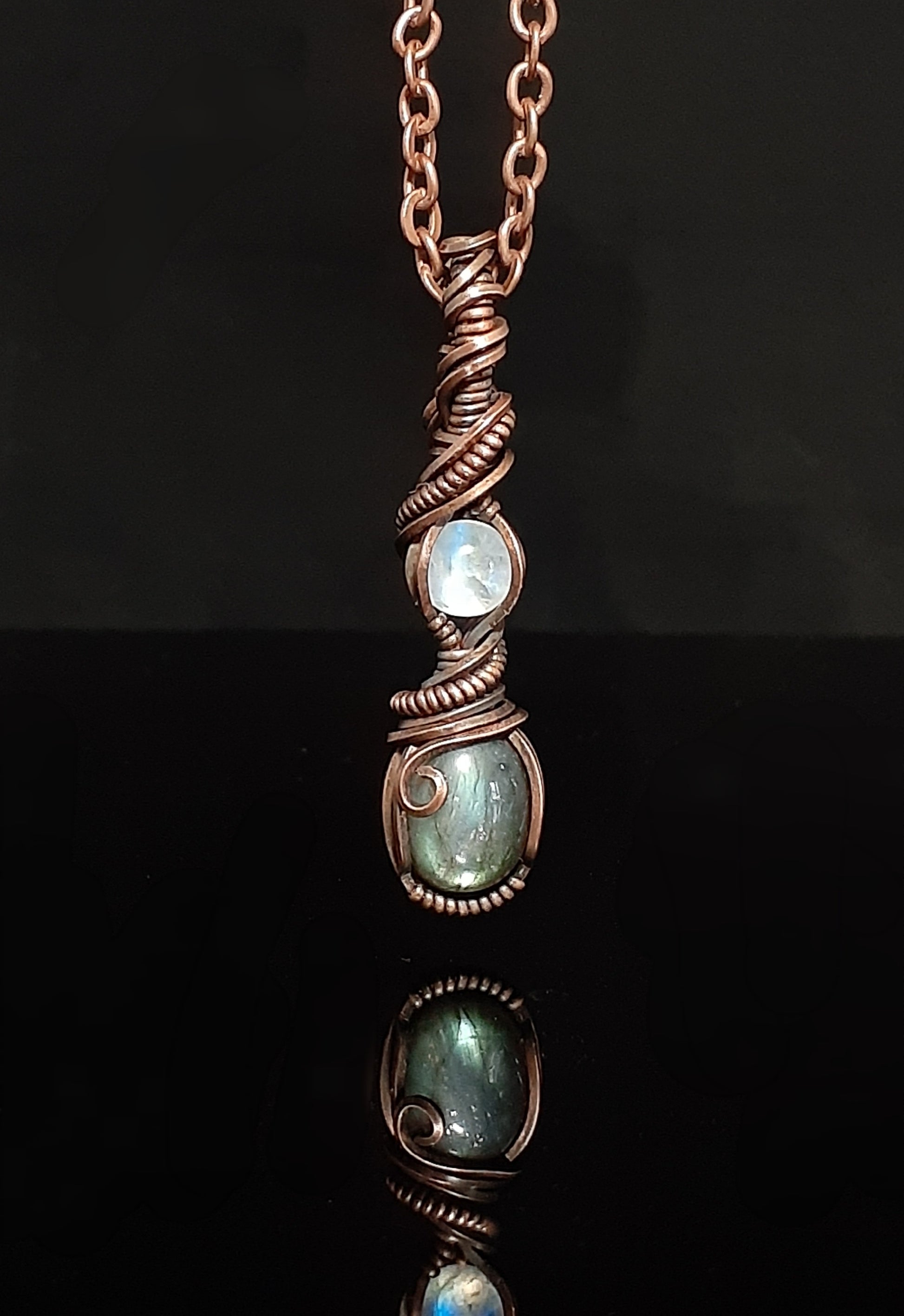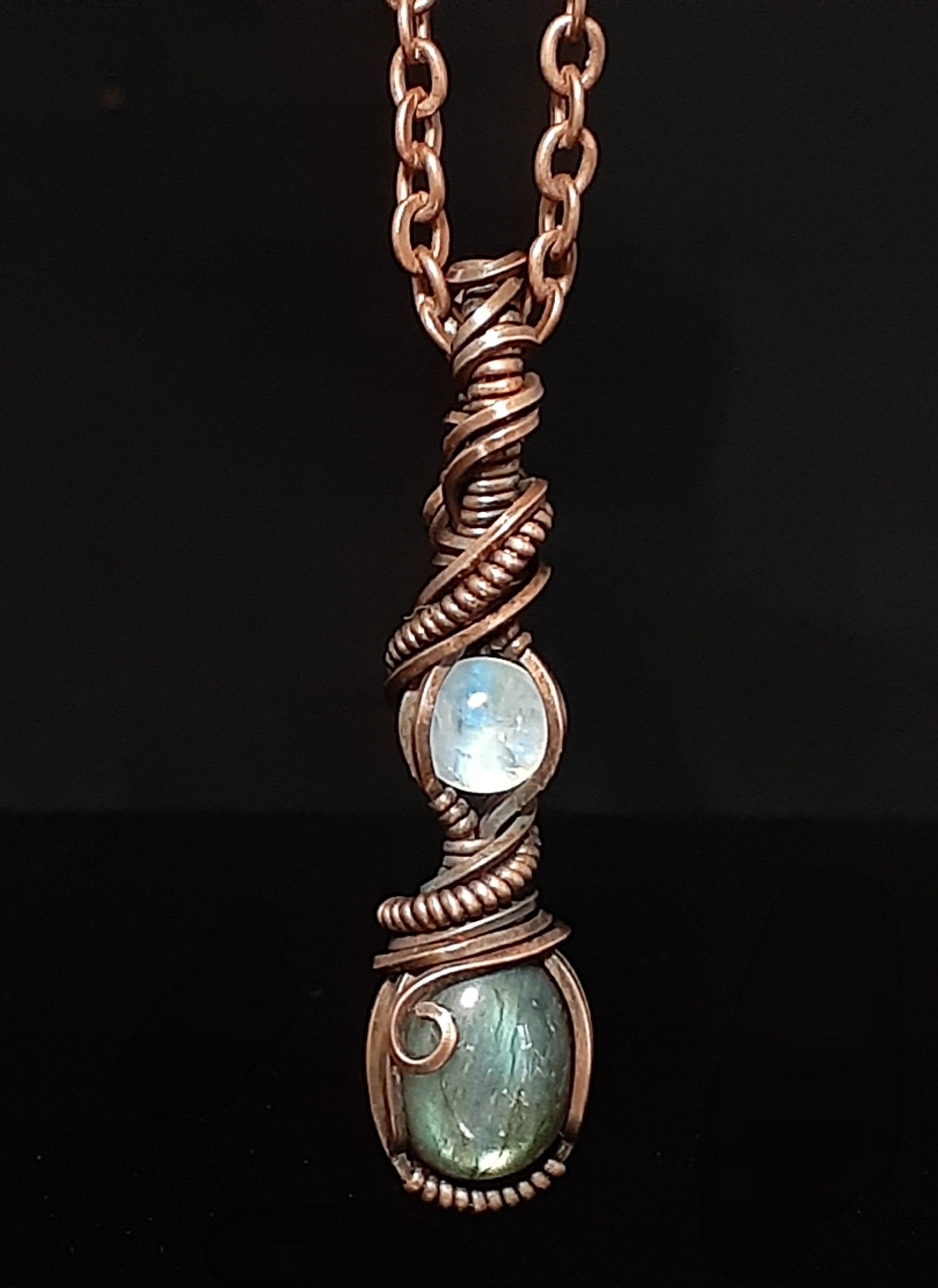 Small labradorite and rainbow moonstone wrapped in oxidized copper