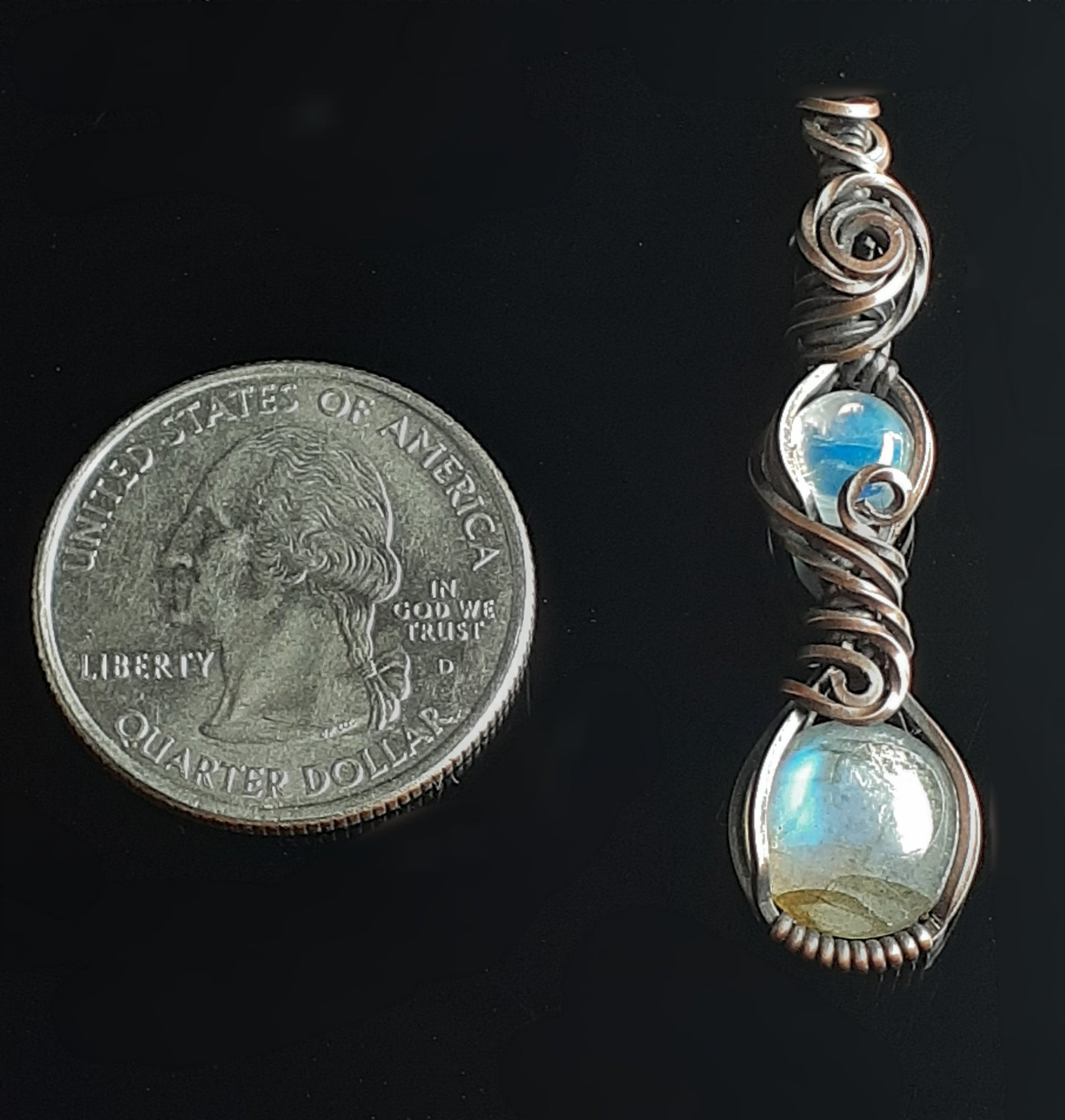 Small labradorite  and rainbow moonstone wrapped in oxidized copper
