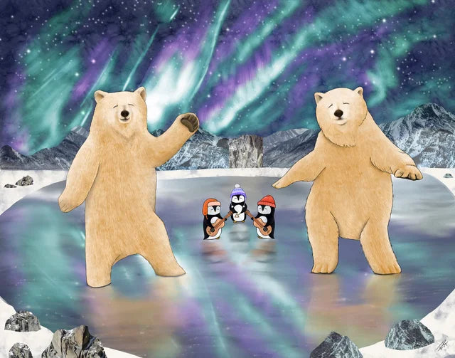 " Boreal Boogie " Dancing Polar Bears with Penguin Fine Art Print