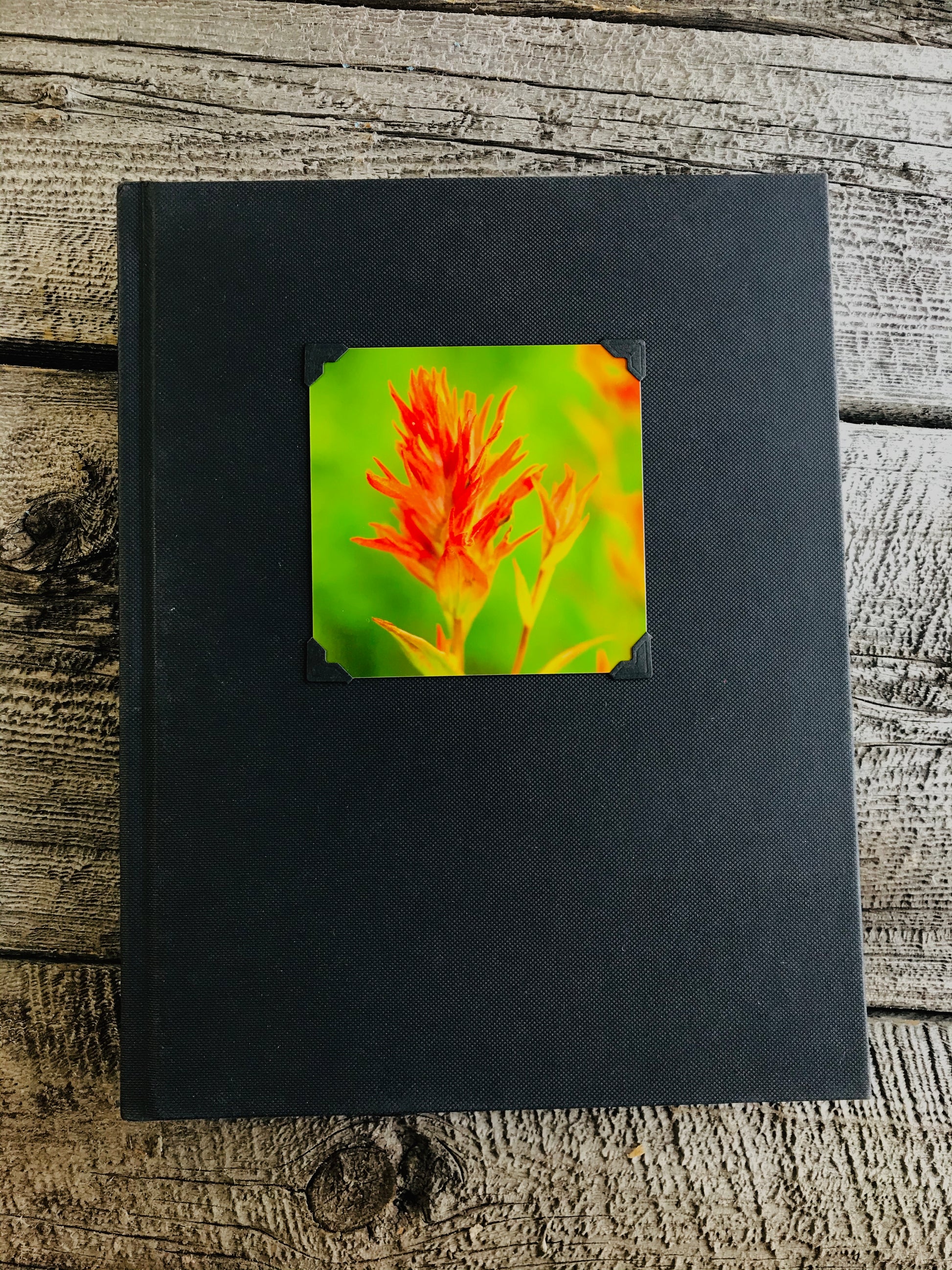 color photo of Indian Paintbrush affixed to front of black sketchbook