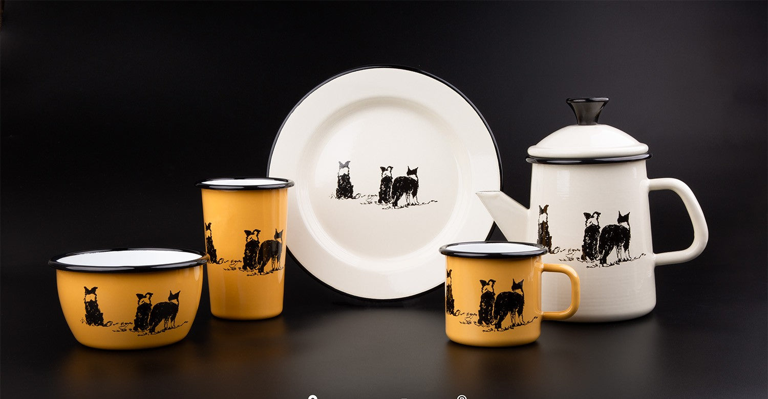 Enamelware is handcrafted in Poland with the artists work " Sheep? " of three border collies printed onto each piece