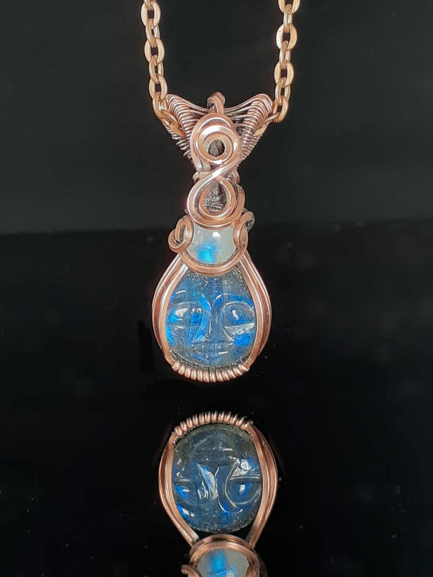 Carved Smiling Face in the labradorite with a small Rainbow Moonstone accent