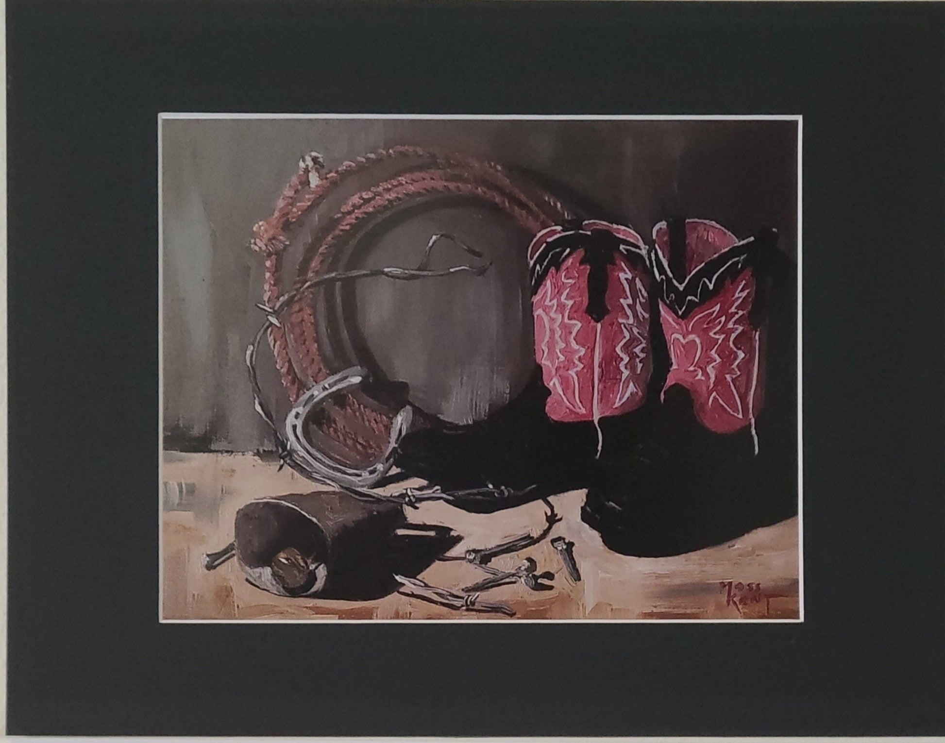 Tools of the Cowgirl trade - boots, rope, horseshoe and nails along with barbwire