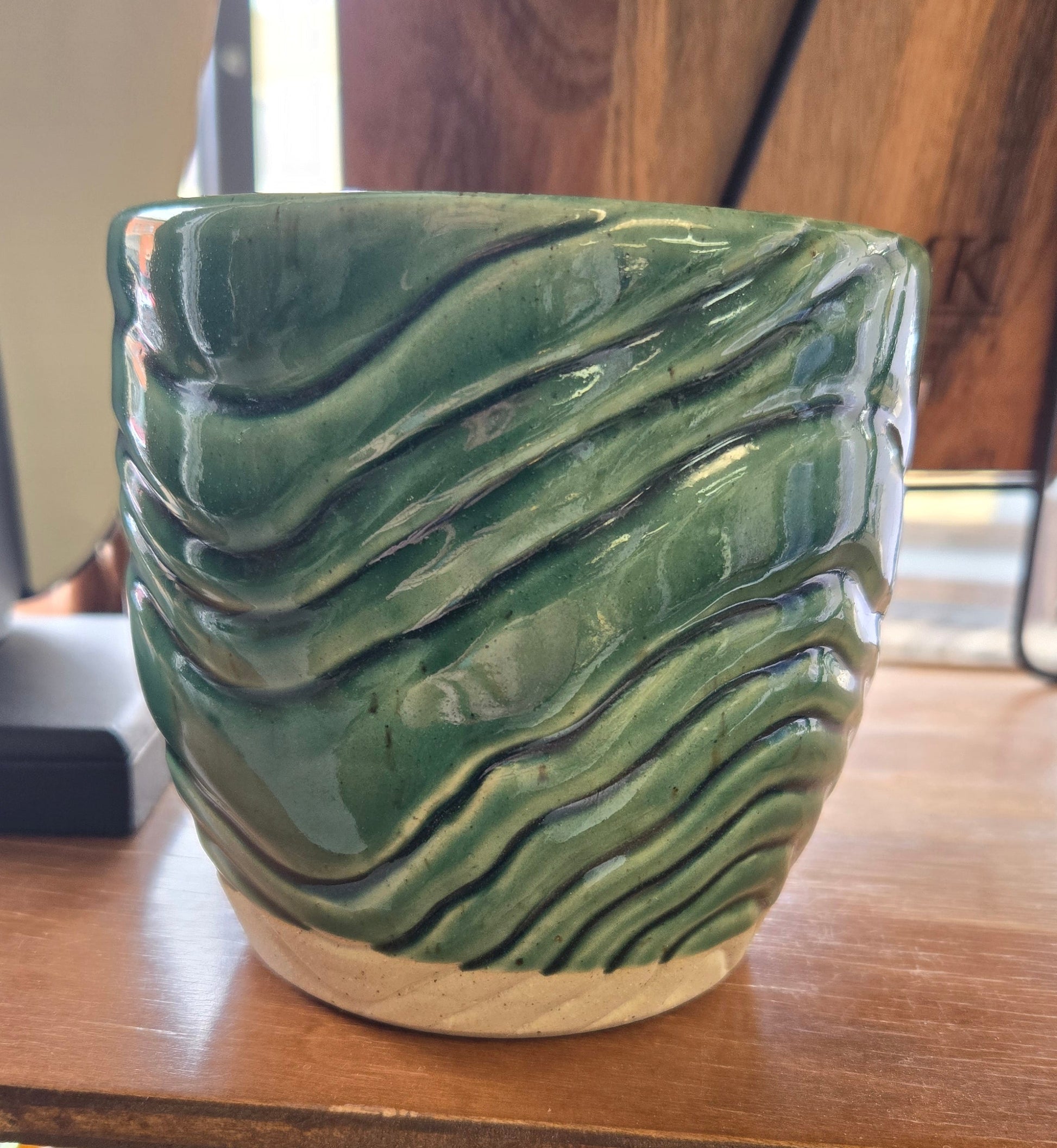 Made with a speckled mixed base clay. Green glaze with textured lines