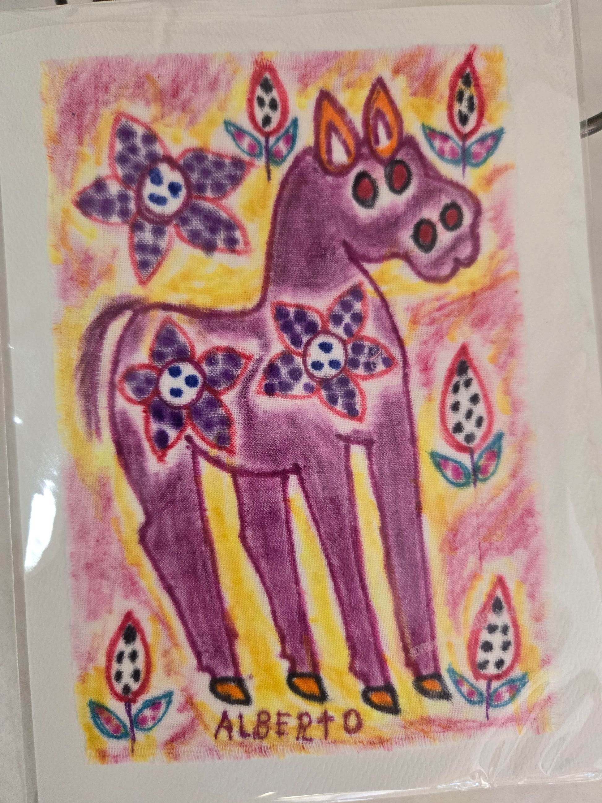 Swatch of fabric hand died and painted by the artist attached to a white parchment paper card.