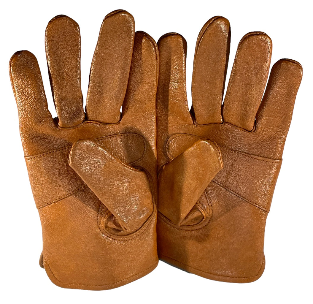 Each pair of leather gloves starts out as raw, white hide. To achieve a fresh-looking pair, 2-3 coats of leather paint is applied front and back (and all those fingers too!) to cover up any discoloration and seal in any repair areas. The paints are specialized for leather, and penetrate the surface far better than a surface-printed design. Multiple thin coats are painted not only to enrich the color but also to ensure that the painting is as permanent as possible.