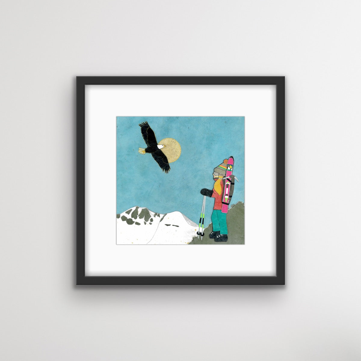 Skier standing at the top of a mountains watching a bald eagle fly overhead