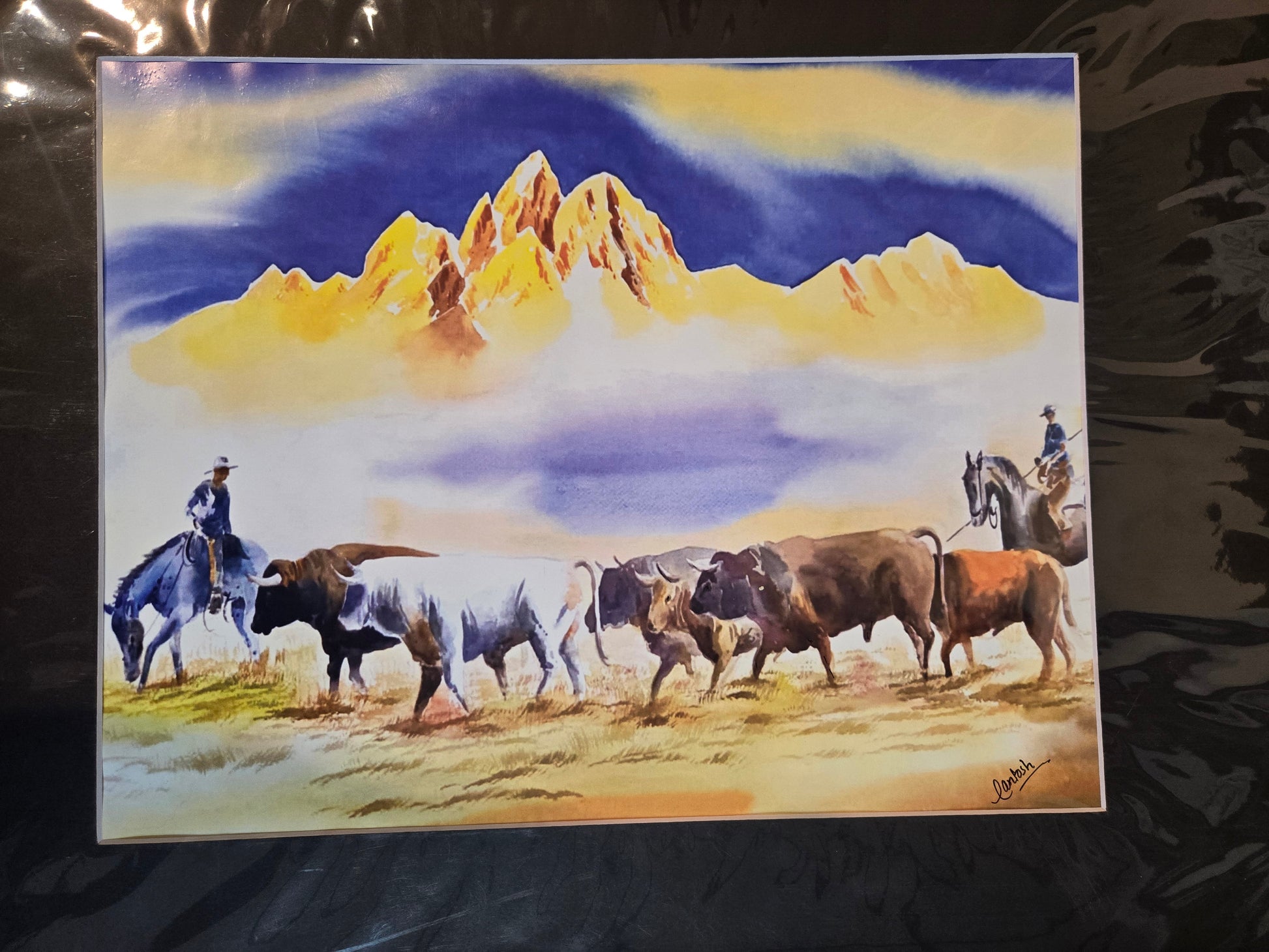 Two cowboys hearing longhorns with the Grand Tetons in the distance