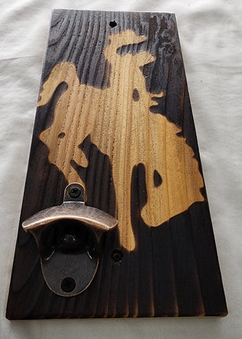 Wyoming Bucking Bronc Wood Burned Background Wall Mount Bottle Opener