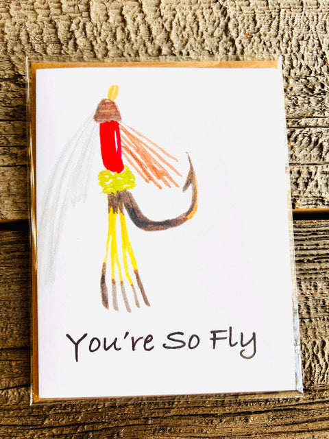 Royal Coachman fishing fly in reds, green and yellow with " Your So Fly " written below the fly